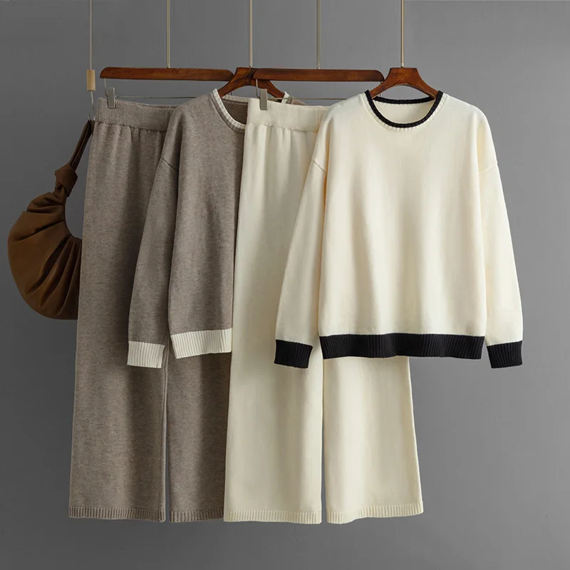 Blubelle Cross-Border Euro-American Winter Casual Contrast Color Patchwork Knit Set Women Crew Neck Sweater + Relaxed Fit